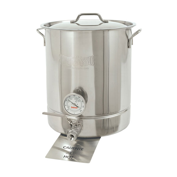 • This is an 10 gallon (40 quart) brew kettle made of stainless steel. It comes with a 1/2 in. NPT detachable ball valve for draining, as well as a 3 in. diameter brew thermometer (with 2 in. stem) and a heat shield to protect the ball valve. The inside of the kettle is graduated for ease of measurement, and features low side indentions. It also comes with a stainless steel lid. Everything you need for doing all your brews in one glorious kettle! Bayou Classic is a trusted name in brewing and has the equipment you need to make fabulous beer, at a great price point!