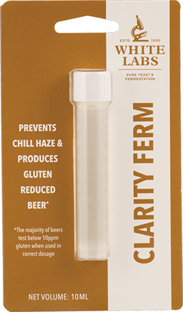 An easy way to eliminate chill haze in your finished beer is to add one vial of Clarity Ferm to your fermenter prior to the onset of fermentation. Use 1 vial per 5 gallon batch.,,For the beer geek (but still simplified!):,Chill haze is caused in your fermenter during aging when polyphenols and polypetides bond together. Clarity ferm cleaves polypetides (a protein fraction) so they cannot bond with polyphenols (tannin). This product is also known as Brewer's Clarex.,,There are also discussions and testing being done with this product, finding that it reduces gluten levels in beer. Gluten is the protein that Gluten-Intolerant (Coeliac) folks need to avoid or greatly reduce consumption of. Always consult a Doctor first before use in this application.,Features:,,,An enzyme that is effective at preventing chill haze,,,Increases shelf-life and product consistency,,,Does not alter beer flavor or aroma,,,Has no effect on head retention,,,Can produce gluten-reduced* beers made with barley (*The majority of beers test below 10ppm gluten when used in the correct dosage),,Shelf life is 6 months.